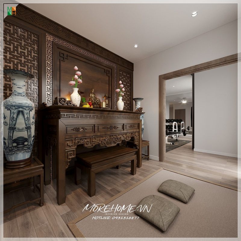 Không gian phòng thờ được trang trí bằng những màu đơn sắc, không phối hợp phức tạp nhiều màu, tạo nên một không gian yên bình, thiêng liêng.