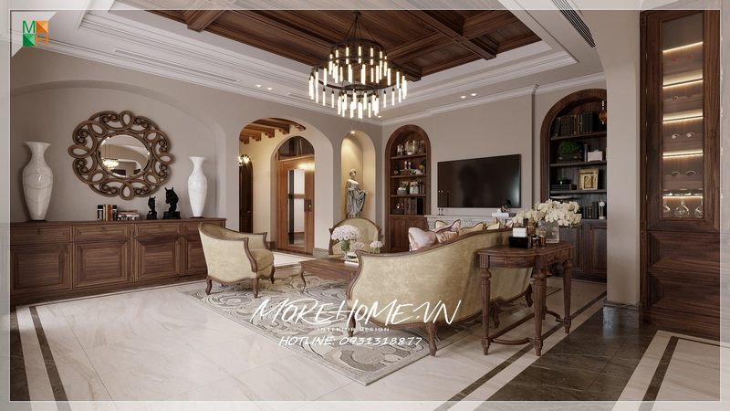 Bộ sofa phòng khách có thiết kế theo phong cách tân cổ điển bằng gỗ óc chó, sẽ làm cho không gian phòng khách của căn hộ chung cư, nhà phố, biệt thự trở nên sang trọng hơn.